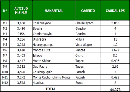 Los manantiales principales del distrito se muestran en el siguiente Cuadro: